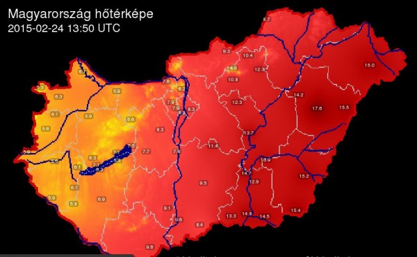 A napok óta felettünk hózódó kettősfrontnak köszönhető az a ritka hőmérséklet-különbség, ami hazánk nyugati és keleti tájai között alakult ki délutánra. Míg a Dunántúlon az esős időben többfelé csak 5 fokot mutattak a hőmérők, addig Hajdúszoboszlón kihelyezett mérőállomásunkon már csaknem 18 fok volt! Közben arrafelé a nap is kisütött, igazi tavaszias hangulatot csempészve az ott élők szürke hétköznapjaiba.